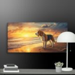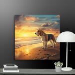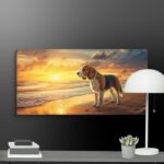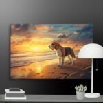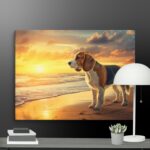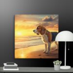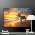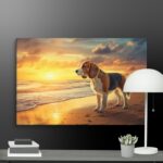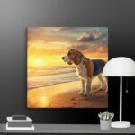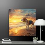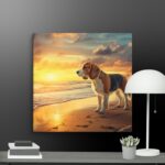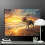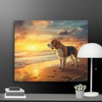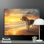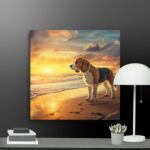 In “Adnath’s Discovery,” a curious Beagle named Adnath embarks on an enchanting adventure along a serene sandy beach at sunset. The warm hues of the setting sun cast a golden glow on the tranquil scene, highlighting Adnath’s inquisitive nature as he sniffs and explores the shoreline. The gentle waves whisper secrets of the ocean, and the soft sand cradles his playful paws. This artwork captures a moment of pure curiosity and joy, inviting viewers to share in the wonder of Adnath’s seaside exploration.