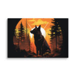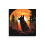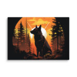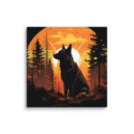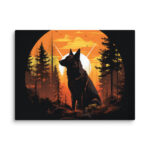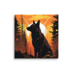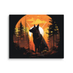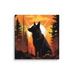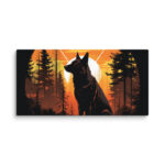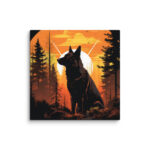 Amidst the tranquil beauty of a dense forest, bathed in the fiery hues of a setting sun, two majestic German Shepherds stand poised. Their intelligent eyes reflect the golden light, capturing a moment of connection with nature and each other. The interplay of shadows and warm tones creates a dynamic composition, evoking the ripple effects of companionship and instinctual guardianship. This piece encapsulates the harmony between strength and serenity, a testament to the profound bond between creatures and their natural environment.