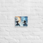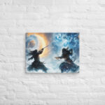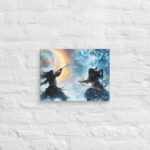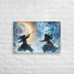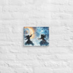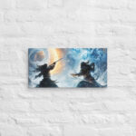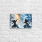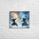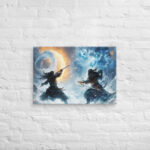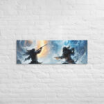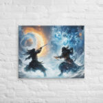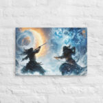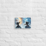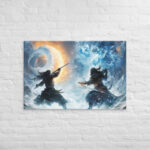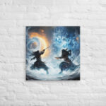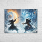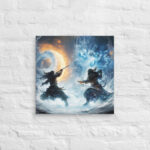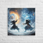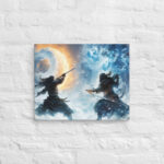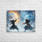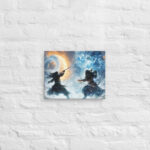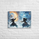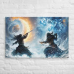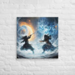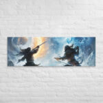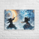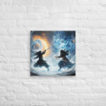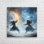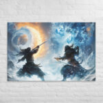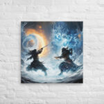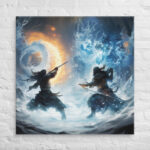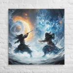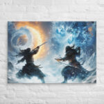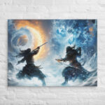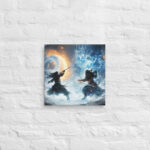 This piece, titled Elemental Duel: Ninjas of Water and Fire, captures the fierce and fluid movements of two ninjas locked in a powerful clash, each wielding opposing elemental forces. One channels the cool, flowing strength of water, while the other commands the fierce and consuming power of fire. The dynamic interplay of water and fire creates an intense scene of contrasts, with liquid splashes and fiery embers colliding mid-air, illuminating the strength and precision of each warrior. The artwork brings to life the ancient battle between balance and intensity, harmony and destruction.