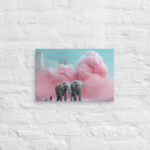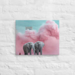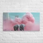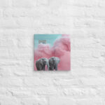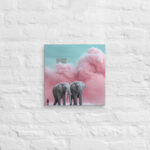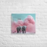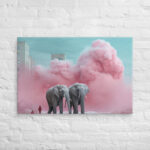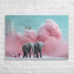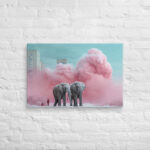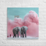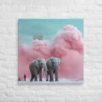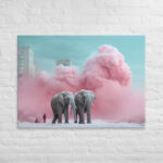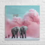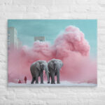 In this evocative piece, two majestic elephants traverse a serene, snow-covered landscape. Their graceful forms, contrasting starkly with the white blanket of snow, create a poignant juxtaposition of warmth and chill. The tranquil scene captures the gentle, yet resilient nature of these magnificent creatures as they move through the wintry expanse, embodying a sense of quiet strength and timeless beauty.