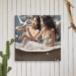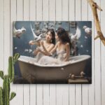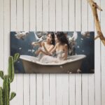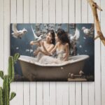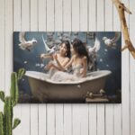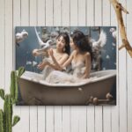 In this enchanting piece, two young girls share a moment of pure bliss as they relax in a serene tub. Surrounded by the gentle cooing of doves, their laughter fills the air, creating an atmosphere of joyful serenity. The soft, pastel colors and delicate brushstrokes capture the innocence and playfulness of childhood, while the doves symbolize peace and harmony. This artwork, inspired by [specific artistic style or artist], invites viewers to immerse themselves in a scene of carefree happiness and tranquil beauty.