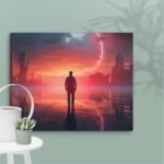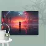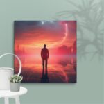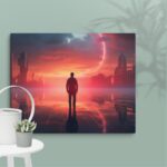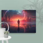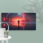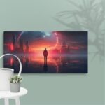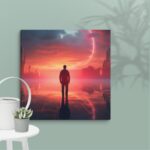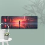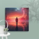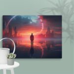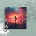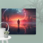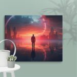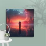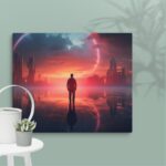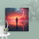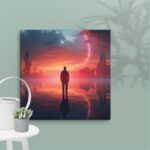 In “Neon Reverie: Reflections of a Red Sunset,” the viewer is transported to a tranquil yet vibrant scene where a solitary man stands against the backdrop of a stunning red sunset. The sky is awash with hues of crimson and orange, casting a mesmerizing glow over the tranquil water below. The reflections in the water mirror the fiery sky, creating a captivating blend of natural beauty and ethereal ambiance. Neon accents subtly enhance the scene, adding a modern, almost dreamlike quality to this evocative moment of serenity and introspection.