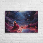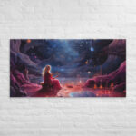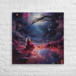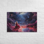 A captivating scene where a woman dressed in violet and dark red stands before a mirror, her reflection bathed in the soft, fading light of autumn. The hues of her attire echo the changing leaves outside, while the mirror adds a surreal dimension, blurring the lines between reality and reflection. The deep, rich colors and the mirror’s symbolism evoke themes of introspection, transformation, and the quiet beauty of twilight moments. This piece invites viewers to ponder the duality of self and the passage of time.