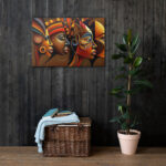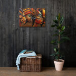 In “Rhythms of Chaos,” DencsiD explores the vibrant energy of African culture through abstract forms and dynamic compositions. This artwork embodies a sense of movement and spontaneity, merging bold colors and irregular shapes to represent the unpredictable, yet harmonious, essence of life. With a deliberate focus on abstraction, the piece challenges traditional representations of African art by embracing chaos as a creative force. The wide 16:9 aspect ratio enhances the viewer’s sense of immersion, allowing the complex interplay of textures and patterns to pulse across the canvas. “Rhythms of Chaos” is a celebration of cultural expression, vibrancy, and the beauty found in the unexpected.