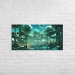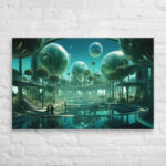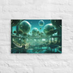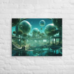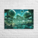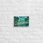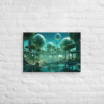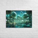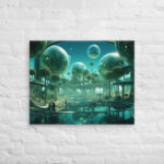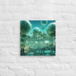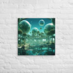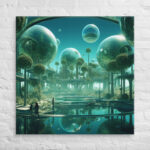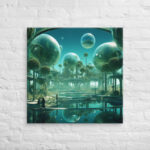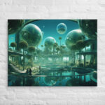 In “Sberverse: The Virtual Frontier,” Aleksandrali transports us into a futuristic metaverse where vibrant shades of green and blue define a boundless digital landscape. Inspired by the technological advancements of Sber, this artwork imagines a world where reality and the virtual blend seamlessly, creating a harmonious balance between nature and innovation. Geometric shapes, fluid forms, and glowing structures populate the scene, representing the limitless potential of the virtual realm. The cool, serene color palette reflects the stability of modern technology, while evoking the dynamic energy of new frontiers in digital exploration.