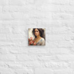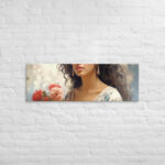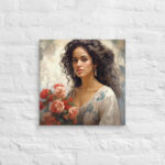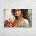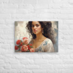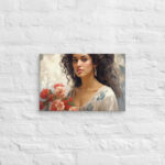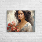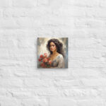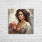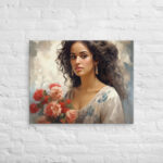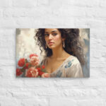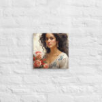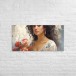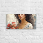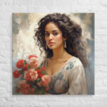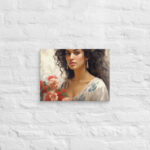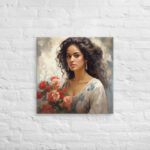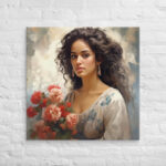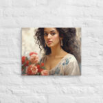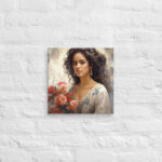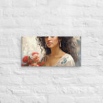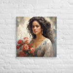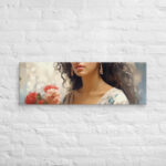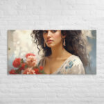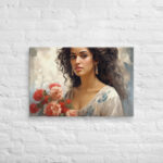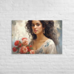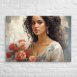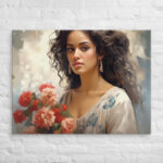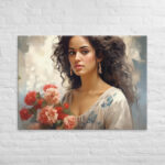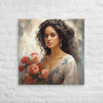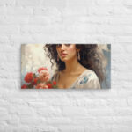 This captivating artwork portrays a beautiful Greek woman adorned with delicate flowers, embodying the grace and connection of humanity with nature. The painting employs a poetic and symbolic style, where the woman’s serene expression and floral embellishments mirror the resilience and growth of trees. With its intricate details and harmonious composition, the piece invites viewers to reflect on the intertwining beauty of human life and the natural world.