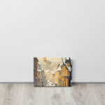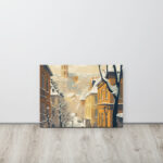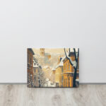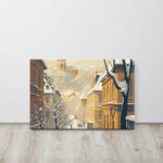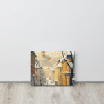 This vintage-inspired poster by Alex Korchevski transports viewers to a serene, snow-covered street, where the quiet beauty of winter is captured in soft, muted tones. The quaint, old-fashioned architecture lining the street evokes nostalgia, while the blanket of fresh snow adds a peaceful stillness to the scene. The artwork’s retro design pays homage to classic poster styles, blending charm and elegance to create a timeless visual experience. “Whispers of Winter” captures the gentle allure of a winter day, inviting viewers to reminisce about simpler times and the cozy warmth of the season.
